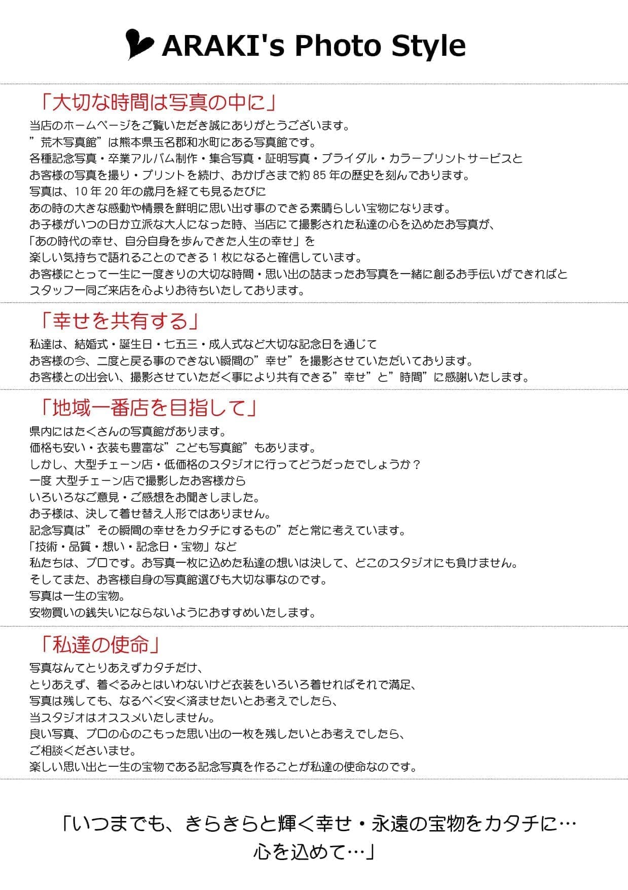 熊本県玉名郡和水町で営業している荒木写真館です。マタニティ・赤ちゃん・お宮参り・七五三・入園入学・卒園卒業・成人式・ウエディングスナップ・家族写真